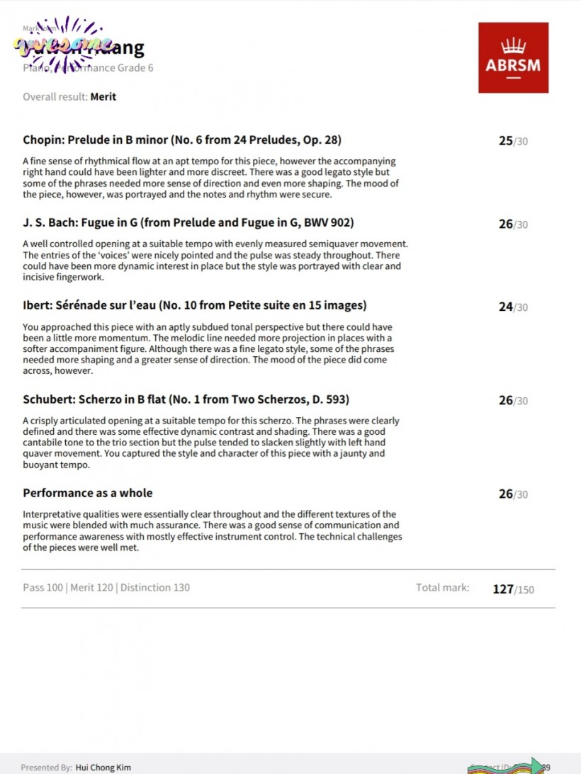 The performance grade exam 6 was hard for me because I had to present all four pieces as a program without a break. My teacher helped me to improve the pieces by giving many other details besides the music, like how to touch so it can produce the right sound, and how to use fingers, hands, wrists, and also pedal. The fast tempo piece was the most difficult for me, because not only the speed but also I had bring out the character of the piece. The grade was better than I expected!