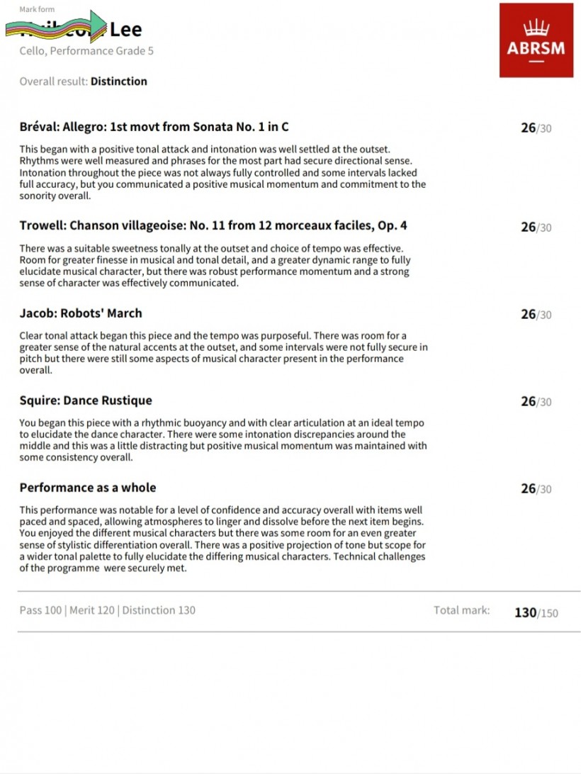 PERFORMANCE GRADE: Cello Grade 5, March 2022